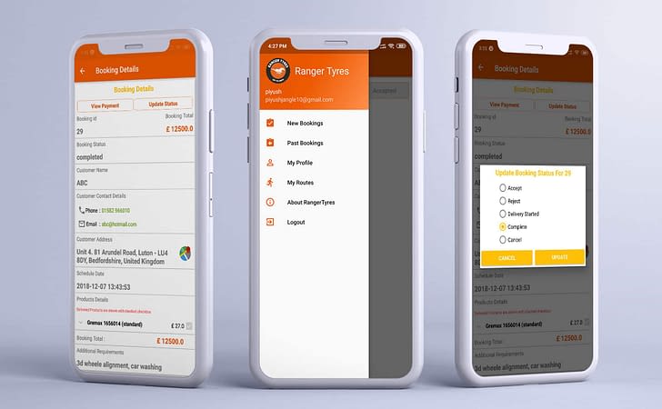 Admin of Ranger tyres can see or find the current location and van drivers routes. Also admin can track the previous routes of van where driver visited. Van drivers can update bookings status as Accepted, Rejected, Delivery Started, Completed.