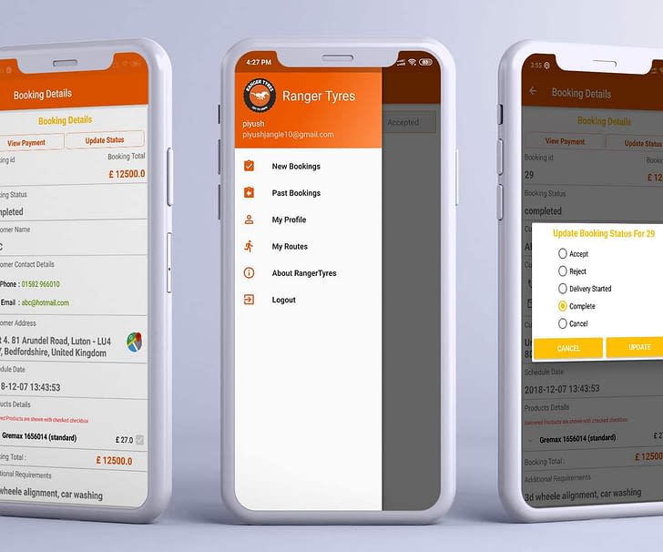 Admin of Ranger tyres can see or find the current location and van drivers routes. Also admin can track the previous routes of van where driver visited. Van drivers can update bookings status as Accepted, Rejected, Delivery Started, Completed.
